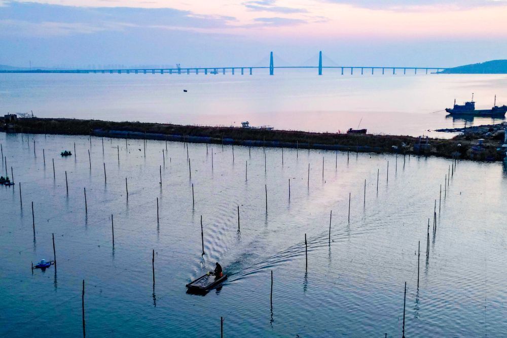 ^ 11月11日,渔民在山东省青岛市即墨区田横镇养殖场巡逻(无人机照片)。新华社发(张光明 供图)