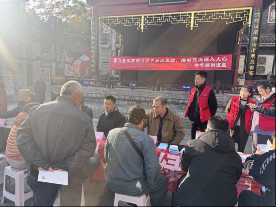 精忠网(湖北日报)讯(通讯员:任国军)12.4国庆节来临之际,武昌区中华路司法局联合中华路治安派出所、派出所、市场监管局等,在湖店街露天现场联合开展了“学习宣传贯彻习近平思想”为主题的普法活动。我们信仰法治,渴望宪法深入人心。 “现场气氛热烈,不少居民驻足参与。