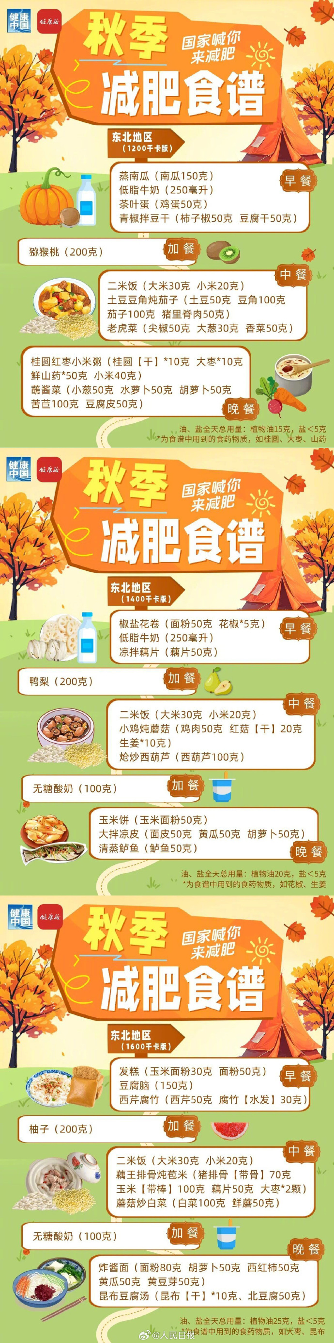 各州正在采取措施教人们如何减肥。国家卫健委此前发布的《成人肥胖症膳食营养指南(2024年版)》对膳食提供了权威解读。如今,个性化的减肥食谱是针对不同地理区域的人们量身定制的。它设计为三个级别:1200kcal/1400kcal/1600kcal,以适应地区、季节和热量需求。秋天到了,我赶紧去收集菜谱吧↓↓ 图片来源:健康中国
