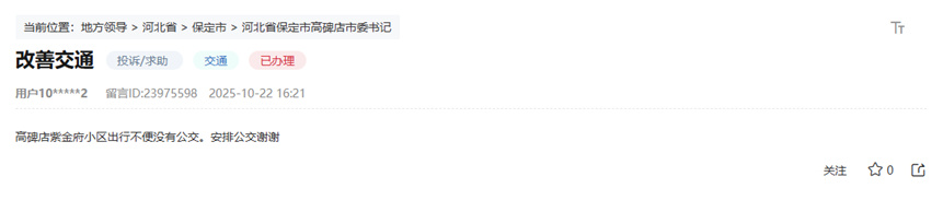 人民日报石家庄10月30日电(记者朱龙超)“政府部门的办事效率真高,我10月22日就留言了,没想到10月27日就看到一辆公交车在我面前跑了,感谢政府部门的办事效率!”近日,当记者再次致电时,河北省保定市高壁店镇的网友刘先生高兴地说:“以后大家出行会更加方便。”位于河北省保定市高壁店的刘氏紫金府社区计划于2018年分阶段交付。周边没有公交车站,导致数千名社区居民交通不便。 “特别是老人、学生和没有车的家庭,必须长途步行才能赶公交车,”刘说。今年10月22日,他通过人民网“领导人公告栏”向高碑店市委书记反映了此事。e.网友留言截图:“高北店紫金府小区没有公共交通,出行不方便,感谢安排公共交通。”网友留言虽然字数不多,但反映的话题却代表了民意。接到网友留言后,高碑店市委社会民意局立即责令市公安局、交通运输局对此事进行调查处理。据市交通局执法人员实地考察,该社区距离市中心较远,周边基础设施尚未完善。此外,由于社区成立不久,公共交通的开发和开通也有所延迟。当地交通局副局长带队赶赴现场,用步行实验测量当地居民与最近的公交车站的距离约为1000米。出行确实不方便。立即联系公交公司协商。原计划是从现有的6号线改道,增设石津府站。经过深思熟虑,综合考虑紫金府社区地理位置、居民出行需求以及运力平衡情况,我们在6号线公交站点调整增设的基础上,采取了“增设一个线路站”的方案。具体来说,客运公司将新增9条客运线路。该线路经停站为首横幸福镇(始发站)、胜利宾馆、人民公园、总医院、紫金府社区、高碑店东站(终点站)。正线运行时间由原来的60分钟改为30分钟,列车班次由原来的间隔改为30分钟。f 15 至 20 分钟至每 10 分钟一次。这样,不仅解决了紫金府社区居民的出行问题,实现了新基地至东站的客运衔接,而且拓展了城市公交的部署空间,平衡了公交线路西密东疏的矛盾,极大改善了城市整体公交运营环境。方案敲定后,客运公司宣布调整6路公交车线路,并于10月27日起开始试运营9路公交车。试运营后,将根据客流等实际情况及时调整车次和列车时刻表。高壁店市公交调整6号线增设9号线公告截图。在处理网友评论的过程中,交警大队进行了现场检查,发现存在以下问题:小区北侧通往高古路的路口存在安全隐患。他们决定在该路口安装四个交通警示柱,并在路口和紫金府小区前的车辆出入口安装垂直警示灯,提醒过往车辆和行人减速慢行,注意安全。官方回应截图